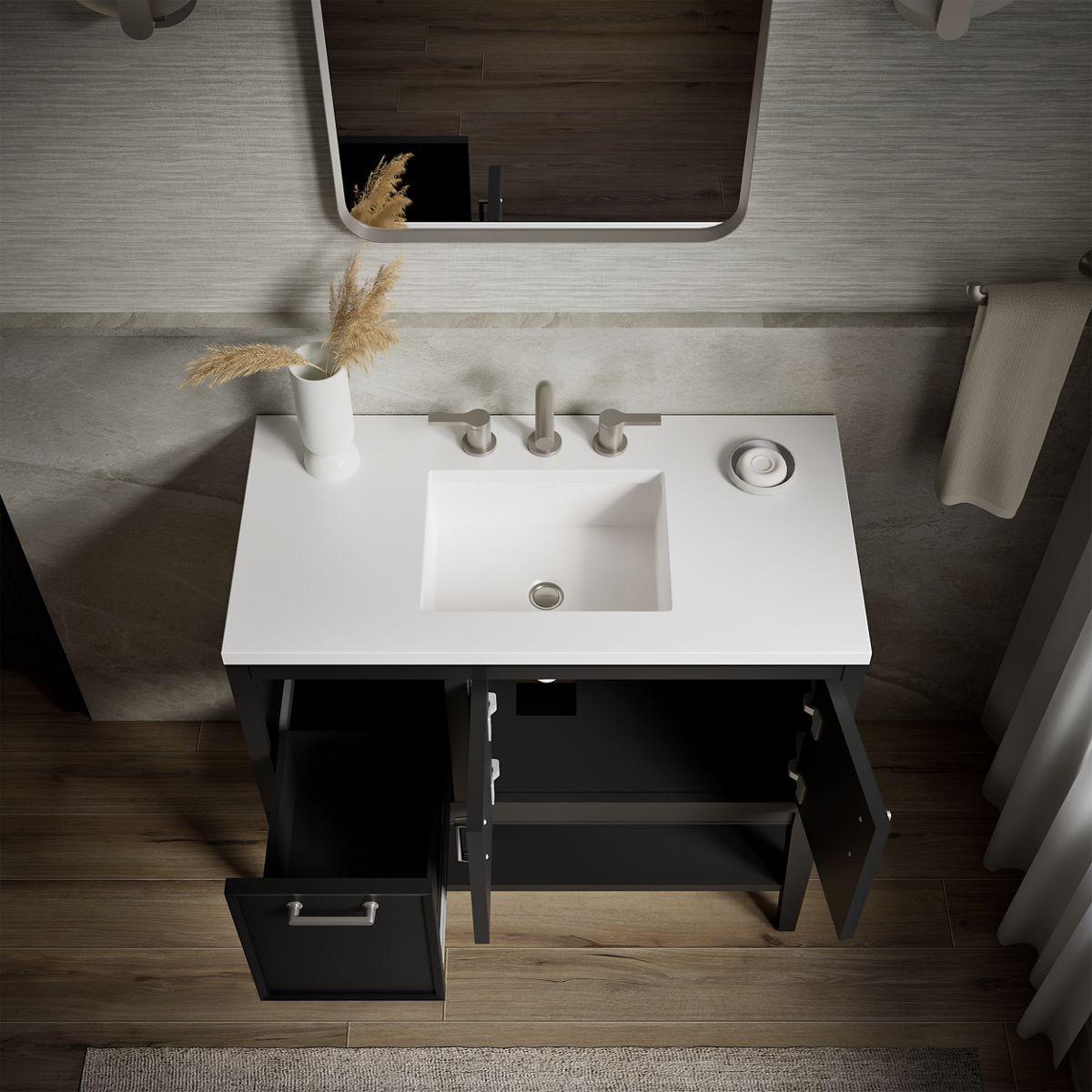 - Finish-matched cabinet interior offers generous clearance for plumbing.