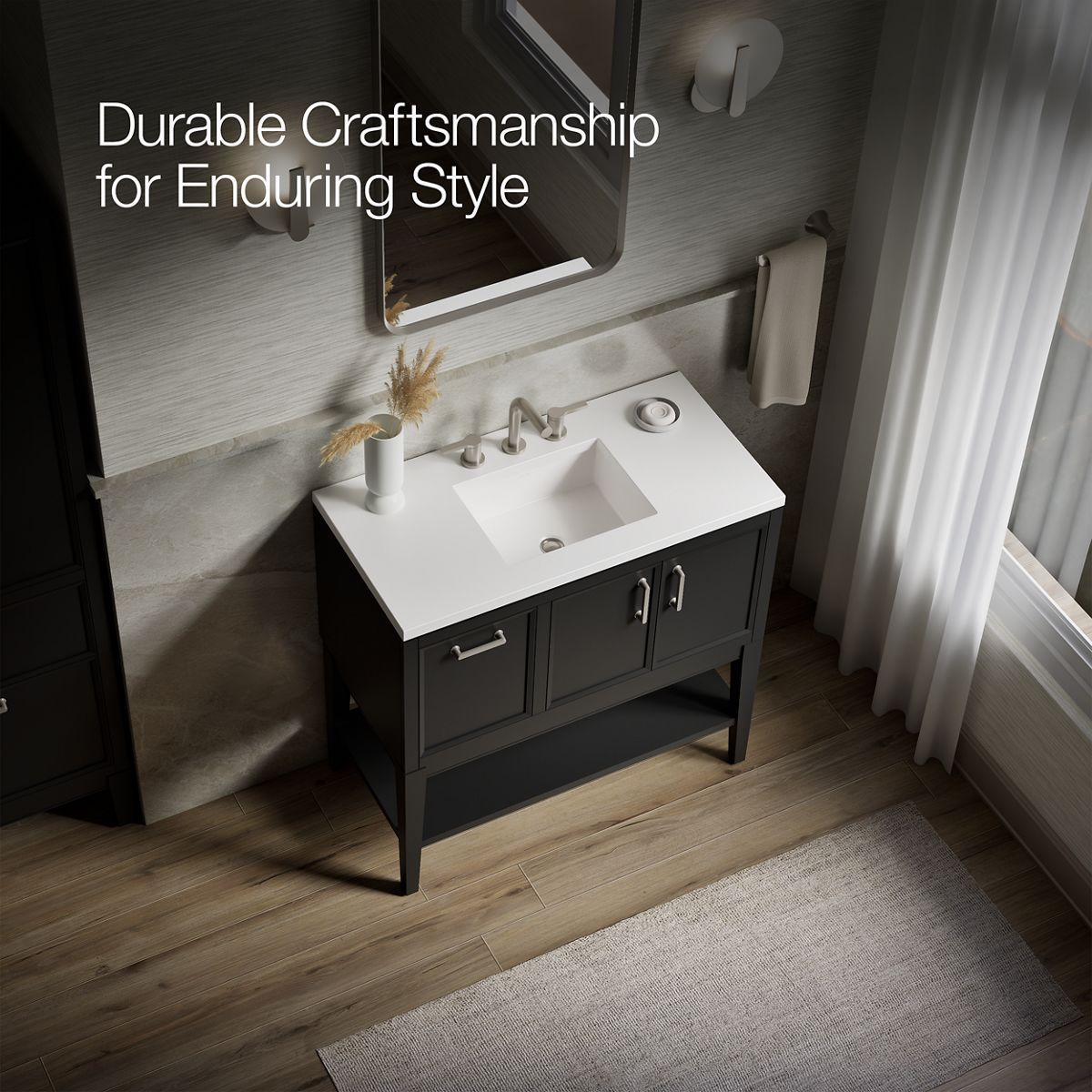- Pure White (PWH) quartz vanity top adds beauty and long-lasting durability