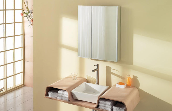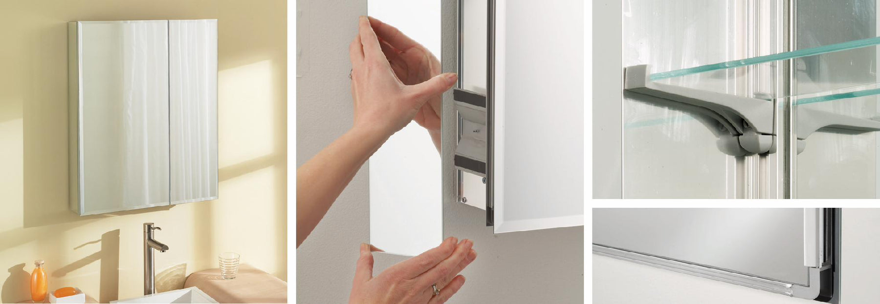Exclusive slide shelf system, Slide Edge Shock-absorbing strip Six-way adjustable 170 hinge Three (BV2426, BV2430, BV3030) or six (BV3630) adjustable glass shelves 1/4 in. (6 mm) thick Mirror trim kit for surface mount included
