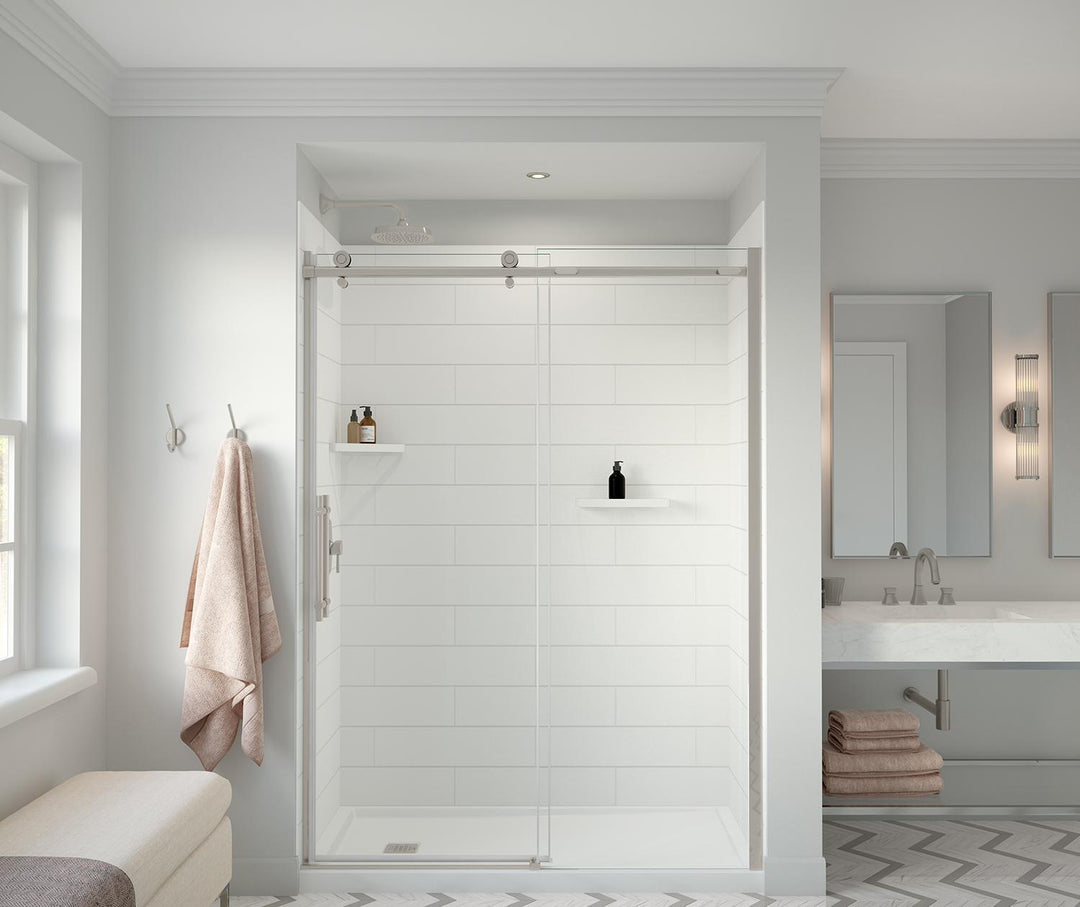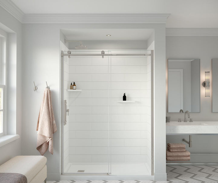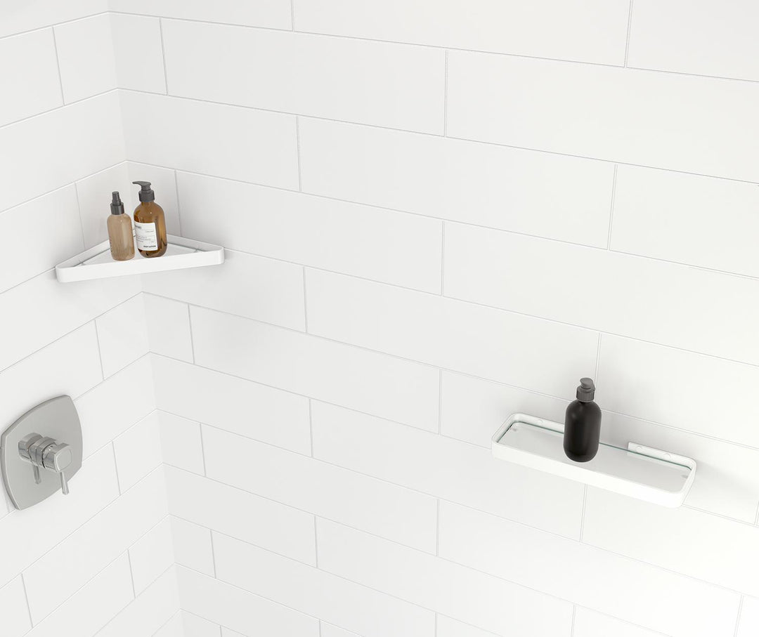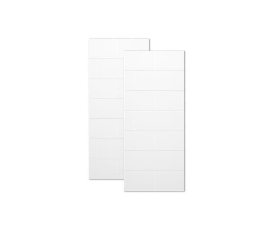 Pairs perfectly with a side wall kit to create an alcove shower Realistic tile wall look made of durable solid surface material with textured grout lines Modern 6" H x 24" W matte subway tile pattern Solid 1-piece wall panels that can be installed directly on drywall or over tile Walls can be easily cut to adapt to most shower spaces and fit on most products Can be paired with a choice of distinctive shelves for additional storage (sold separately)