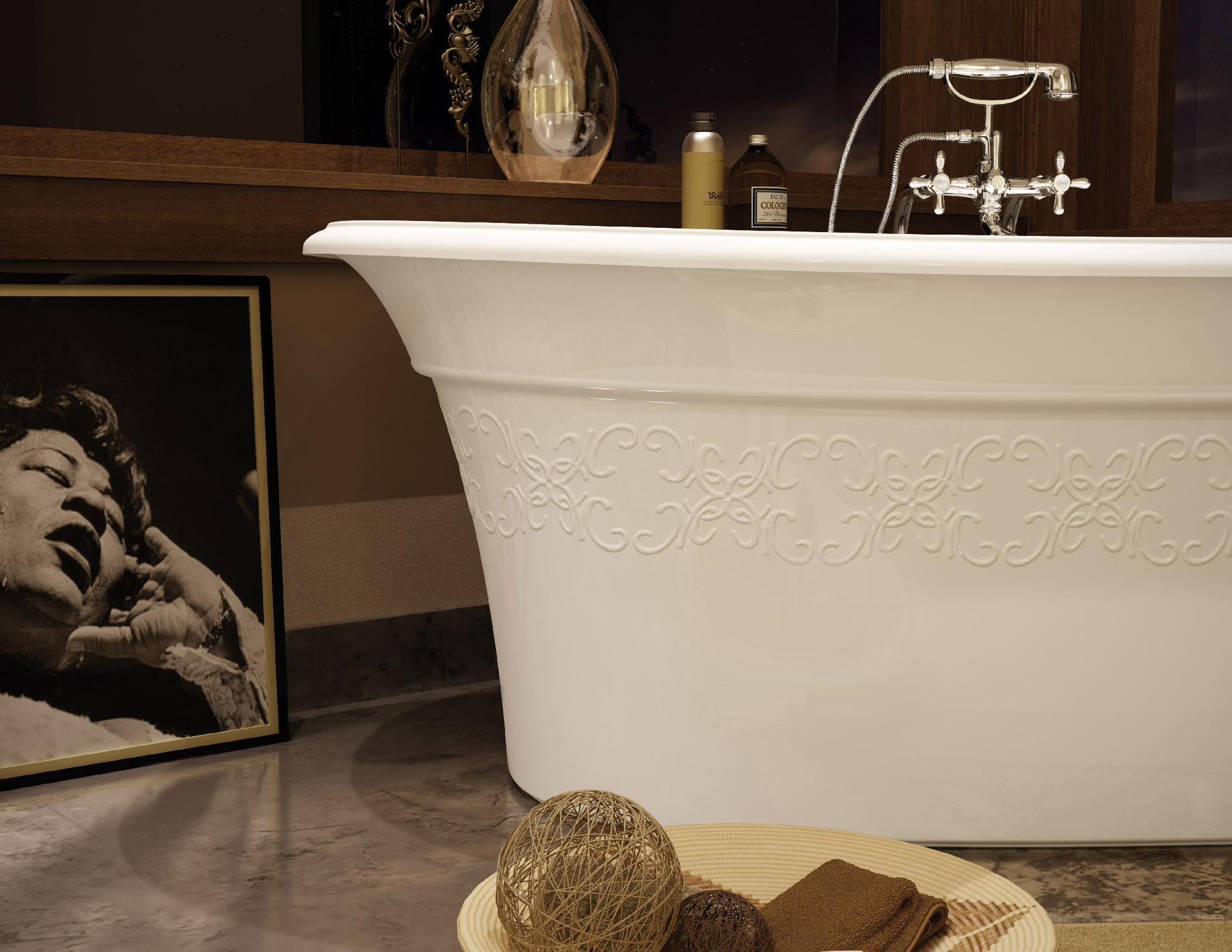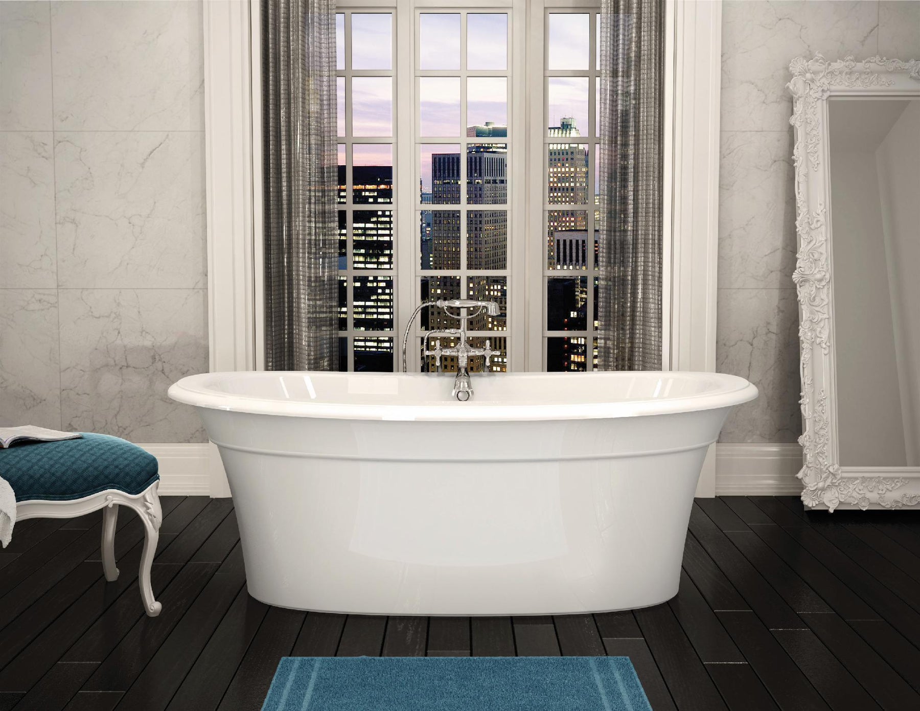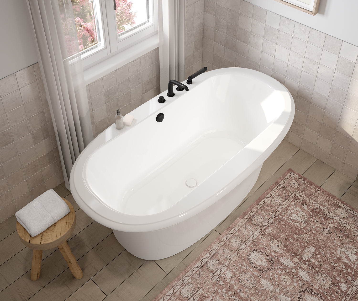Classic oval 2-piece freestanding bathtub with concealed seam Comfortable backrest and ample deck space for faucet installation MAAX innovative leveling legs for easy installation Above-the-Floor Rough (AFR) and F² Drain compatible Apron available in standard colors and 3 designer colors No massage systems available Center drain