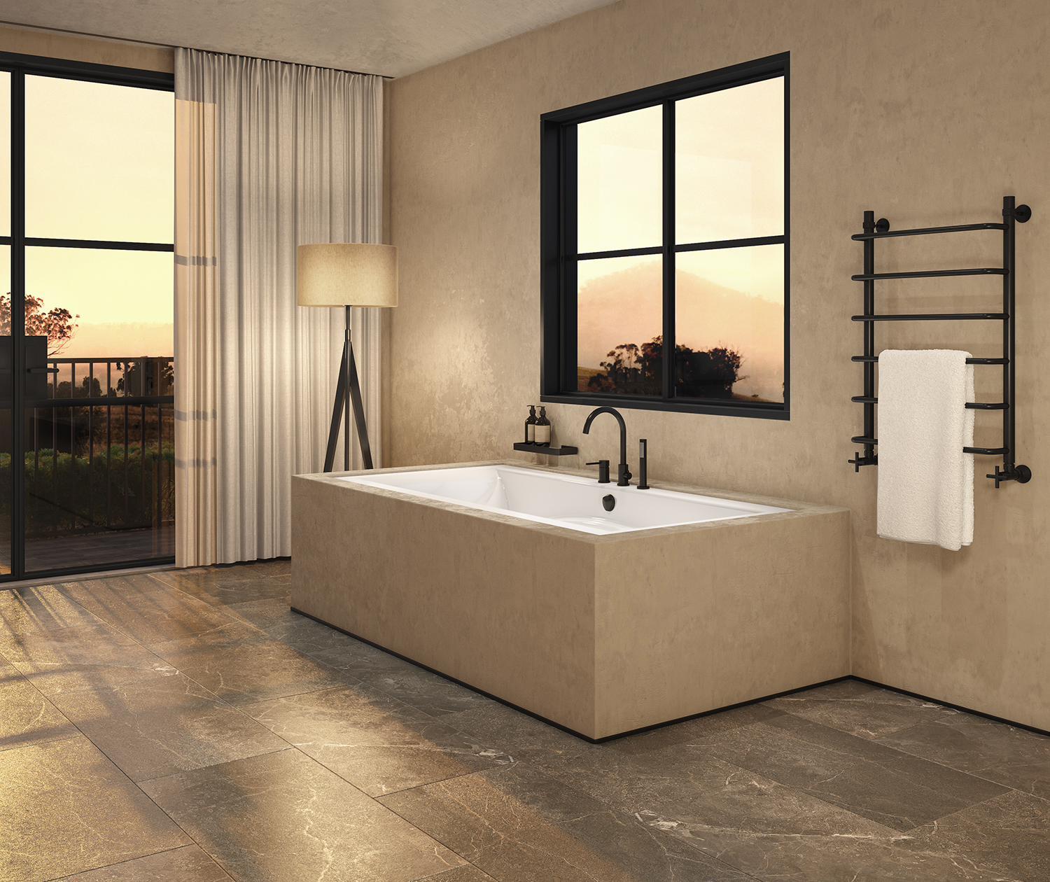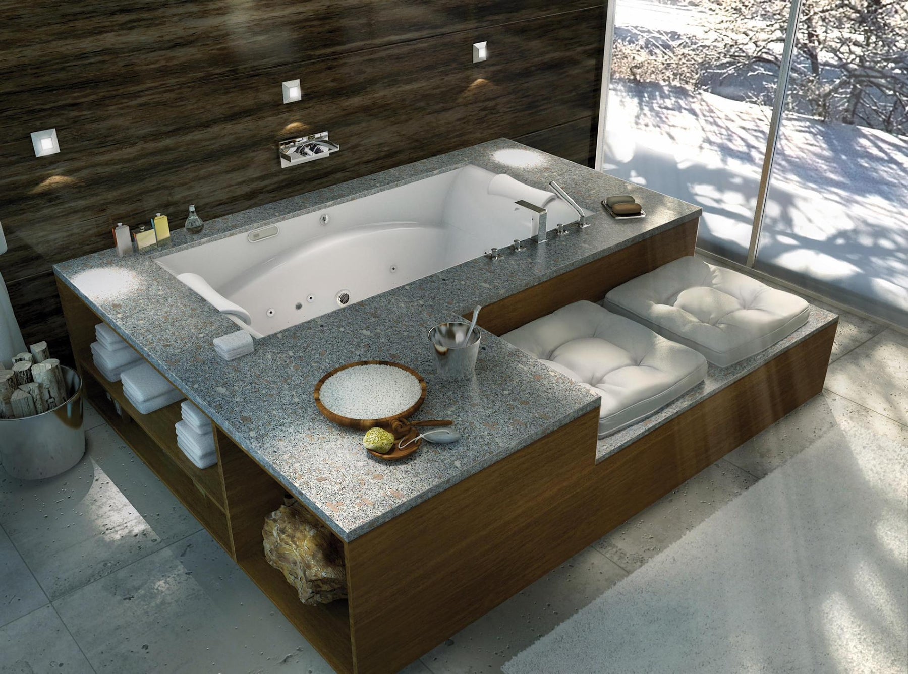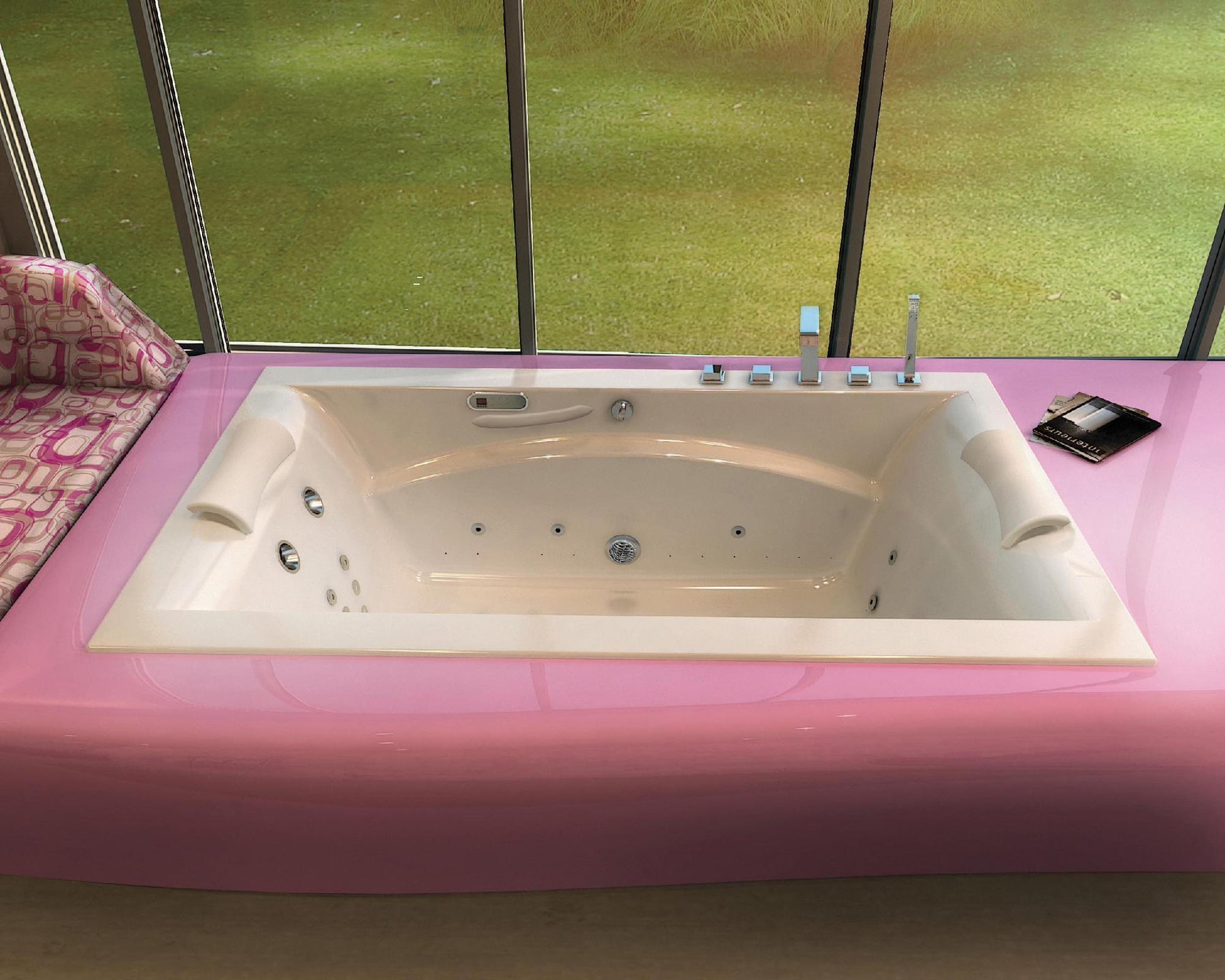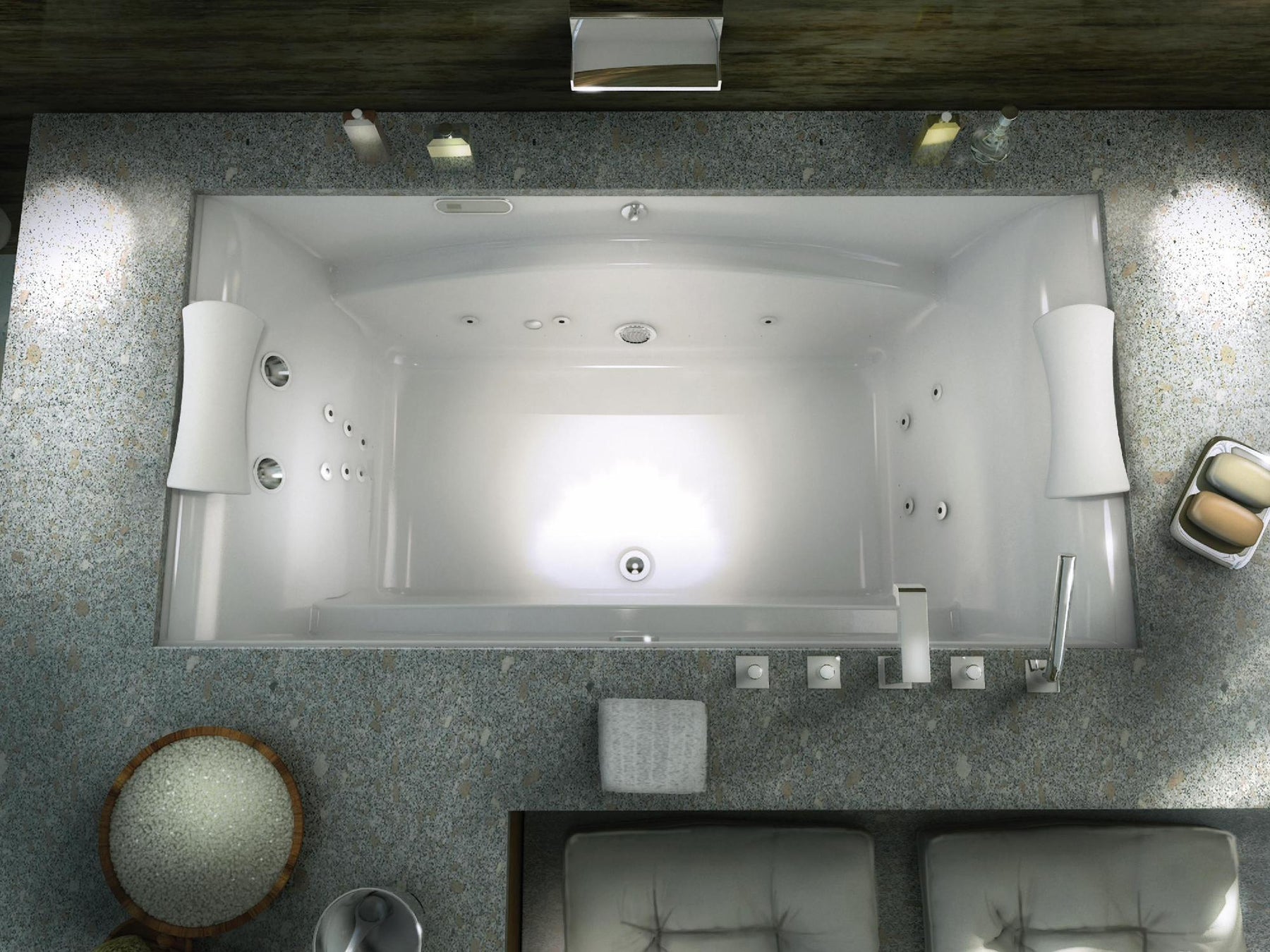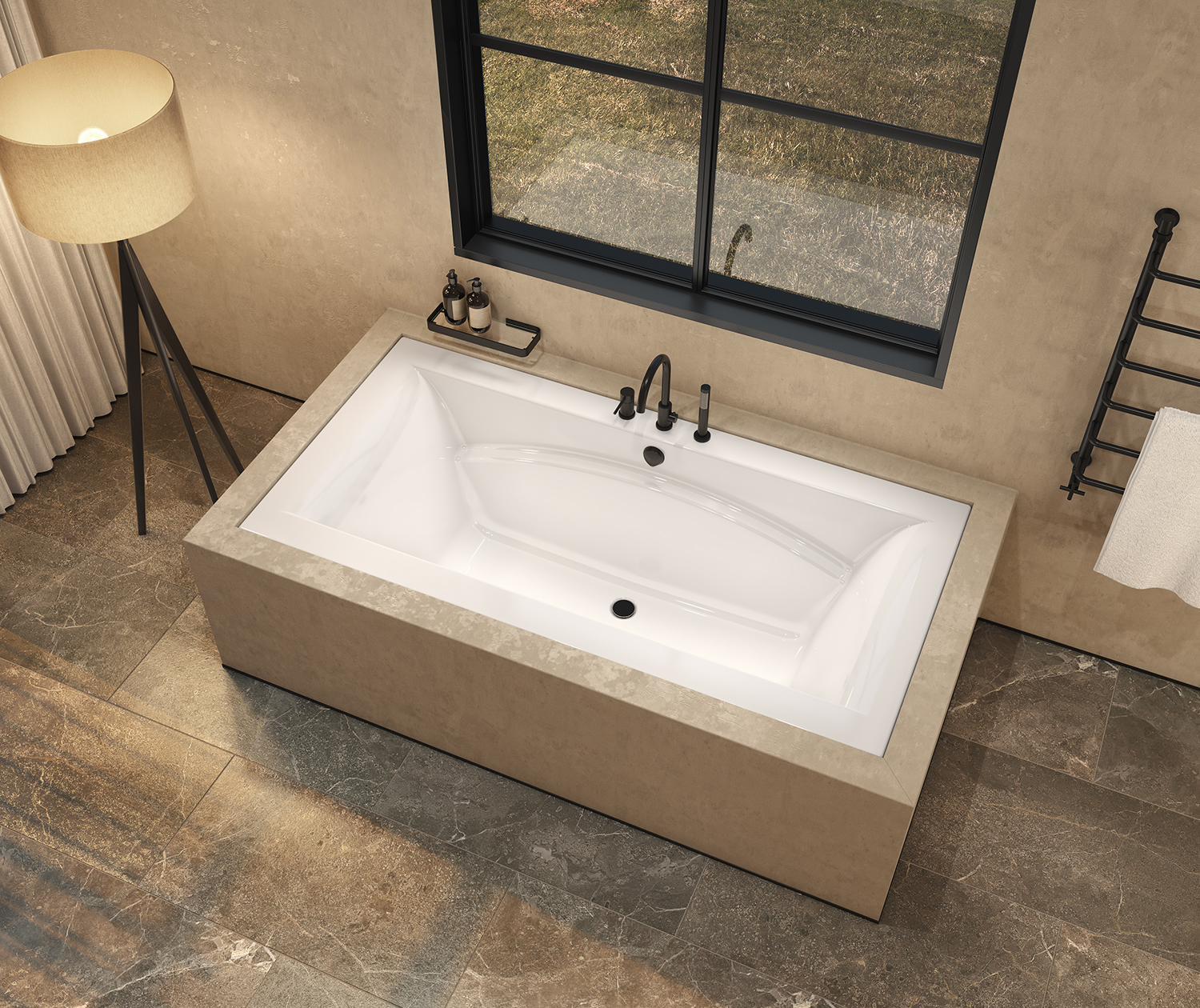 Sleek bathtub combines straight and curvaceous lines Inclined backrest, curvaceous armrests and deep bathing well Ample deck space for faucet installation Undermount or drop-in installation with center drain Two 12 in. grab bars option available Magnetic cushion available in black or white Magnet backed headrest for cushion. Factory installed only if cushion ordered on initial order