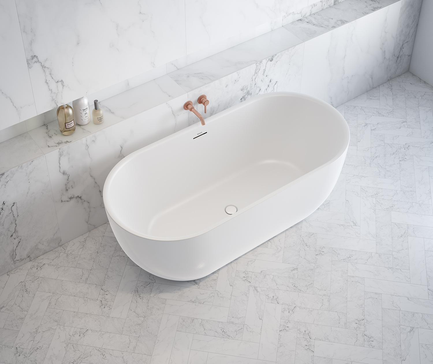 Seamless 1-piece bathtub with a symmetrical look Large bathing well with comfortable backrests and center drain Linear waste and overflow (pre-installed) Available in matte or glossy finish with white or black apron F2 Drain compatible Leveling Legs