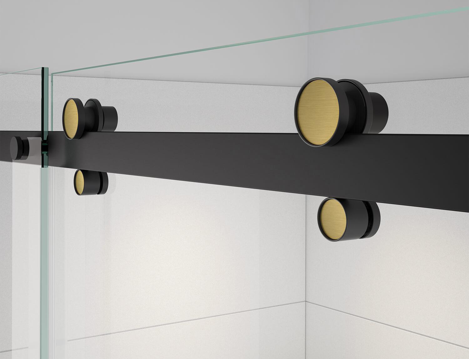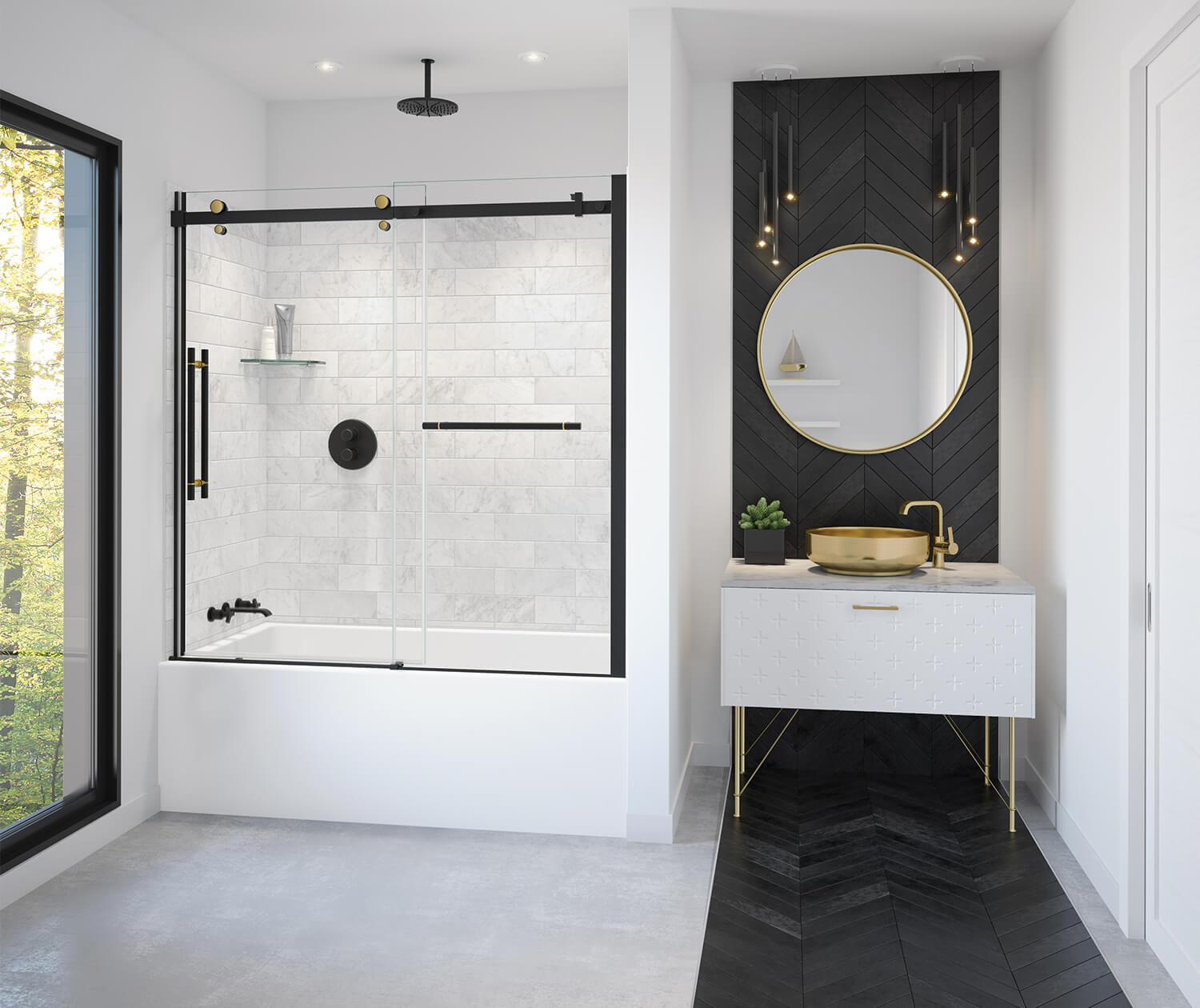 Rollers and handle offered in 7 different finishes (monochrome or mix-finishes) 59" high clear glass panel 8 mm (5/16") tempered glass with Lotus easy clean protection Detachable door guide to distance the glass when cleaning Reversible tub shower door for left or right opening This configuration is shipped in 2 boxes With a convenient towel bar on the fix panel