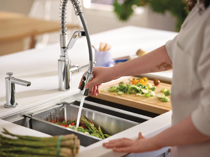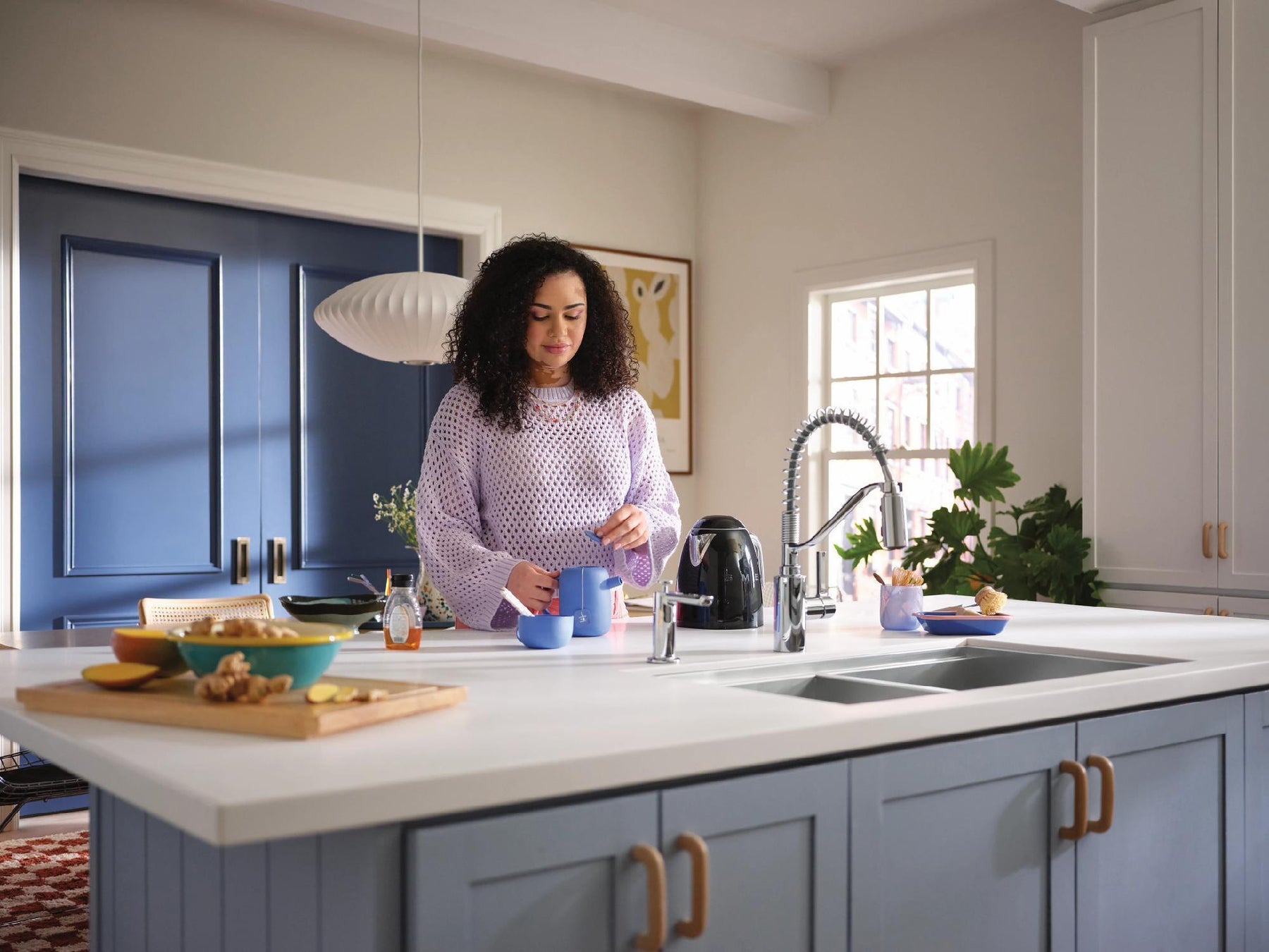 The contemporary tiers and flat planes of the Genta LX pulldown faucet bring an appealing, yet bold, style that makes a statement in any kitchen.