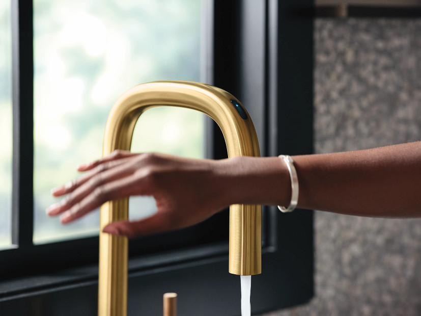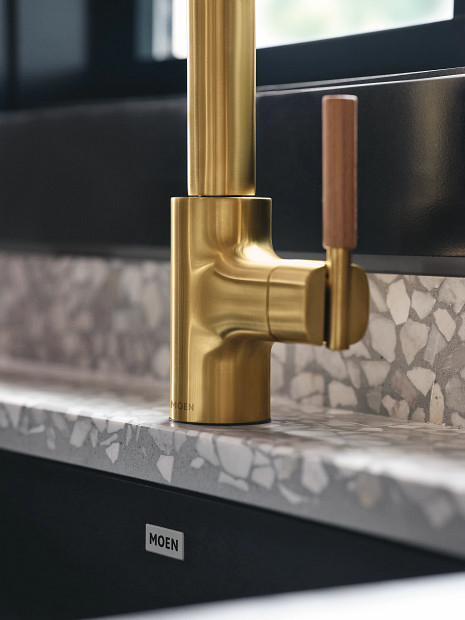 The Moen Smart Faucet with Motion Control adds the perfect blend of intelligent technology and warmth to the modern kitchen. With Tenon, you don’t have to sacrifice style to embrace innovation. The advanced sensor technology allows touchless operation of both the temperature and water flow by using simple hand motions , while the voice activated and app based features give you additional control and personalization. The soft, sweeping curves, organic forms, and teak wood handle add a calming aesthetic to the smart faucet. Available in Brushed Gold, a mix of classic gold tones and modern brushed texture for the perfect touch of contemporary glamour.