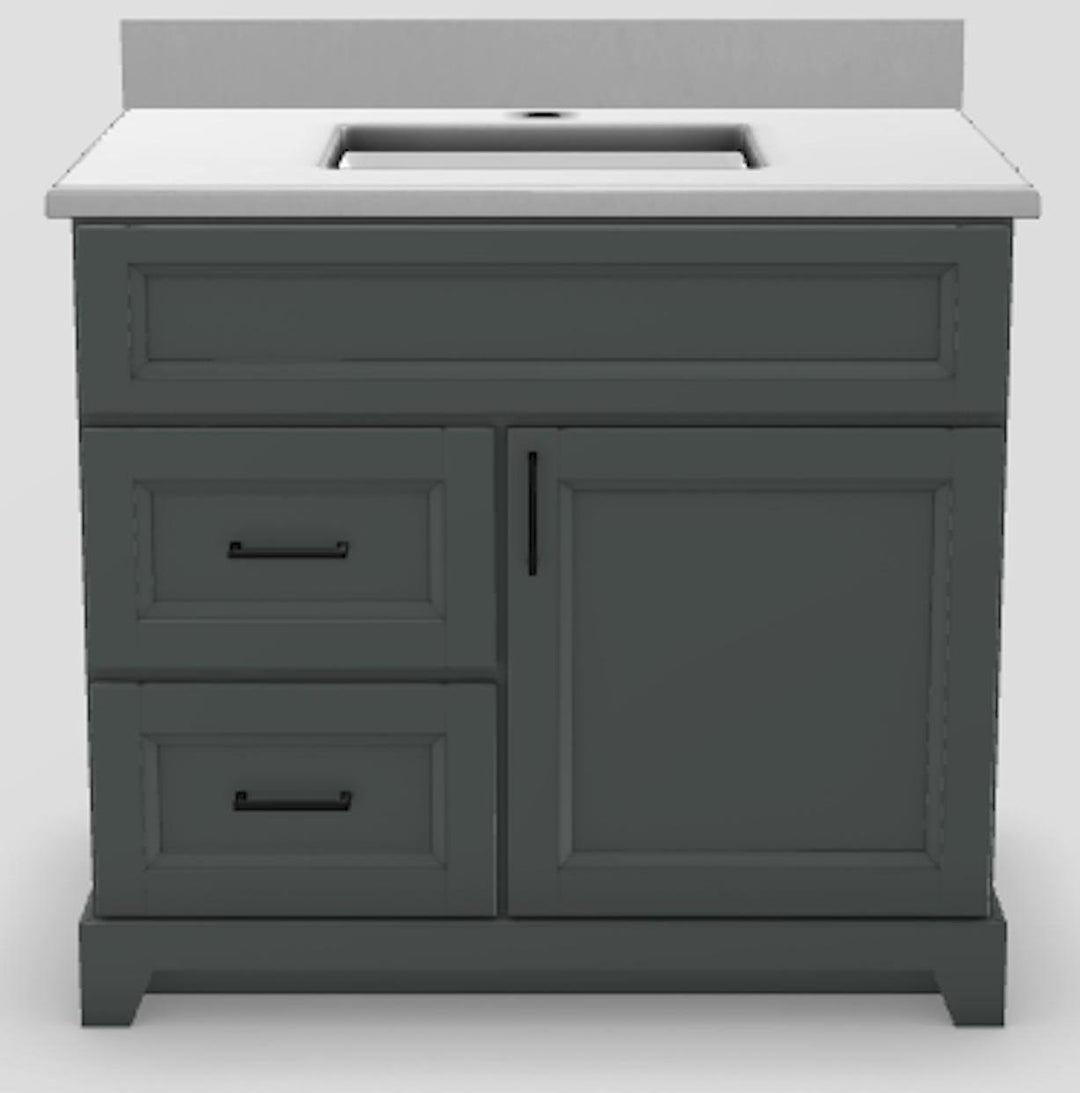 36" LH Drawer Standard Vanity Bellrose with Square Handles and 1-Hole Quartz Top - Moss Grey/Black/Dover White/Classic White PNT36LHMOSSSQBLK Stonewood Cabinetry