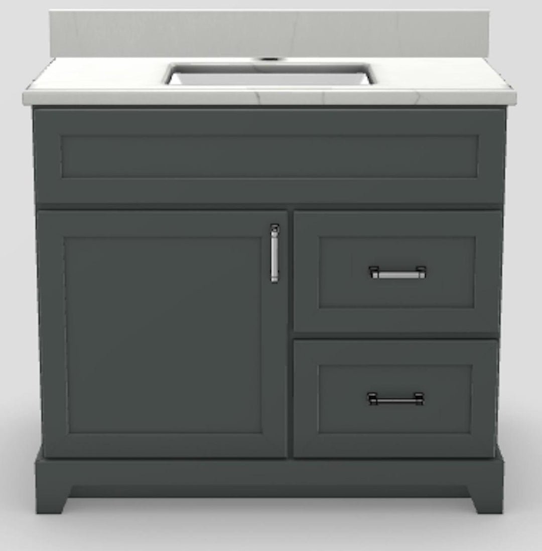 36" RH Drawer Shallow Vanity Modern Shaker with Bevelled Handles and 1-Hole Quartz Top - Moss Grey/Chrome/Carrera/Classic White 1836MSGRYBVCHRMCARCLWH Stonewood Cabinetry