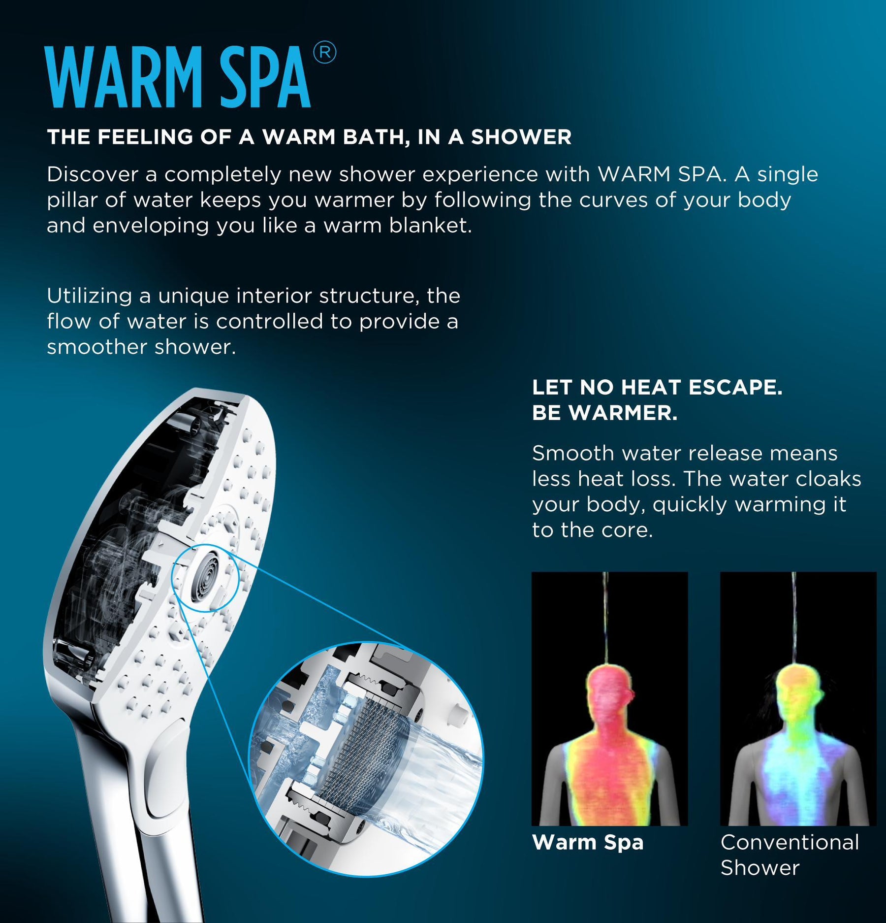 - THE FEELING OF A WARM BATH, IN A SHOWER - Discover a completely new shower experience with WARM SPA. A single pillar of water keeps you warmer by following the curves of your body and enveloping you like a warm blanket.
