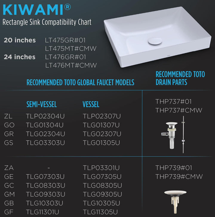 The TOTO Kiwami Rectangular 20" Vessel Bathroom Sink with CEFIONTECT is a modern and elegant sink that incorporates beautiful thin edges. The Kiwami Vessel Sink features CEFIONTECT glaze that keeps your sink cleaner for longer by minimizing waste from sticking to the ceramic surface. The Kiwami Vessel Sink features a front overflow and is ADA compliant. Faucet and drain must be purchased separately. Compatible drain THP737#01 (Kick Lever) or THP739#01 (Wire Type) is sold separately.