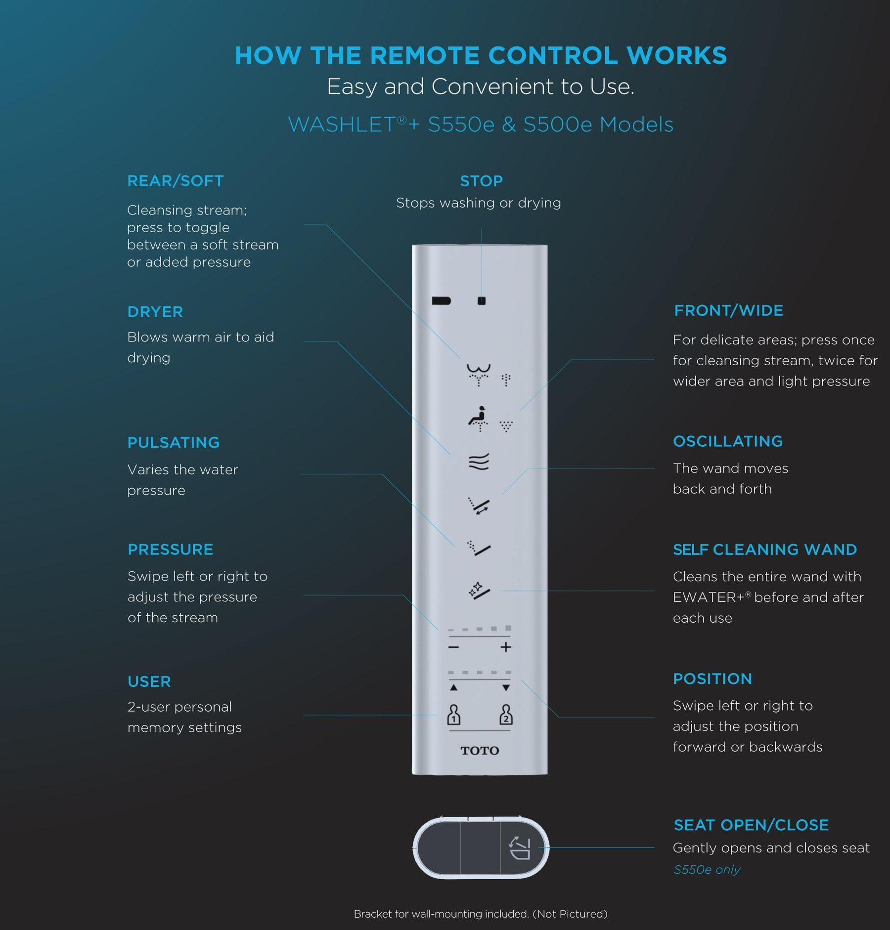The TOTO® T40 WASHLET®+ Ready S500e Elongated Bidet Toilet Seat with EWATER+® and Auto Open and Close Classic Lid is an electronic luxury seat that cleanses you with warm water, providing an exceptionally clean feeling. Instead of traditional toilet paper that can sometimes be rough and often ineffective, the WASHLET quickly provides comfortable warm water cleansing at the touch of a button. The TOTO T40 WASHLET+ Ready WASHLET S500e is designed to conceal the WASHLET bidet seat's power cord and water supply hose for a seamless installation. The WASHLET features TOTO's technologically advanced EWATER+ system that mists the wand and toilet bowl, reducing the need for harsh cleaning chemicals. PREMIST® wets the surface of the toilet bowl, aiding in the removal of waste and resulting in a better clean. The TOTO WASHLET S500e is operated by a luxury style illuminated touch pad remote with 2 user memory to save preferred settings. The WASHLET features 5 spray settings, heated seat, and instantaneous water heating. The newly redesigned lid style resides flush with the toilet bowl, providing a streamline look and giving the impression of an integrated system. The WASHLET reduces the need for toilet paper, saving trees and water used to manufacture each roll. Medical conditions, age, and debilitating illnesses can make using the bathroom without assistance almost impossible; but with a WASHLET, just the touch of a button can leave you feeling clean. Includes mounting and connection hardware. WASHLET+ Ready WASHLET models are designed to work with TOTO T40 WASHLET+ Ready toilets only. If you are looking for a WASHLET bidet seat to fit your existing toilet installation, please look for WASHLET models that do not contain WASHLET+ in the description.